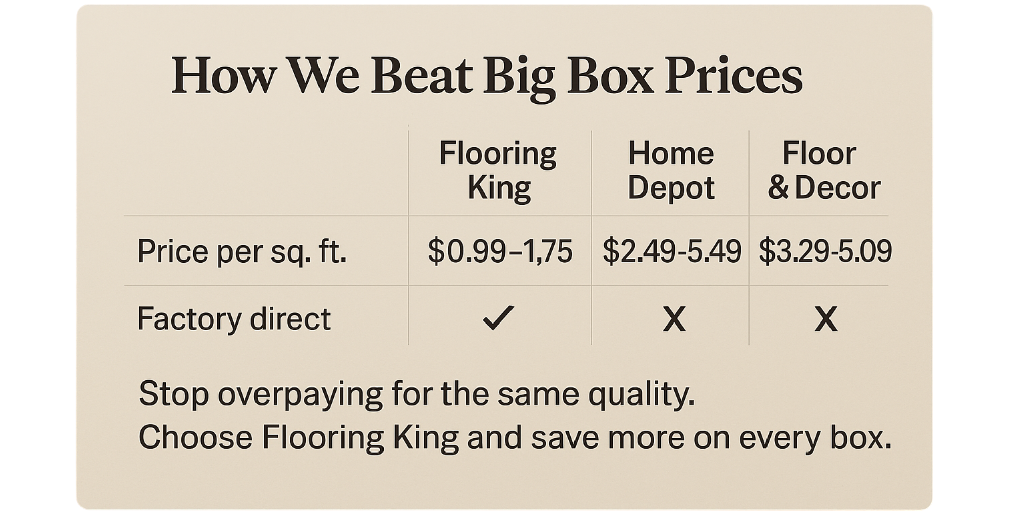 At Flooring King, we cut out the middleman to give you premium flooring at unbeatable prices. While other stores charge retail markups, our factory-direct model ensures you pay only for quality — not for overhead. Compare and see why smart homeowners choose Flooring King.